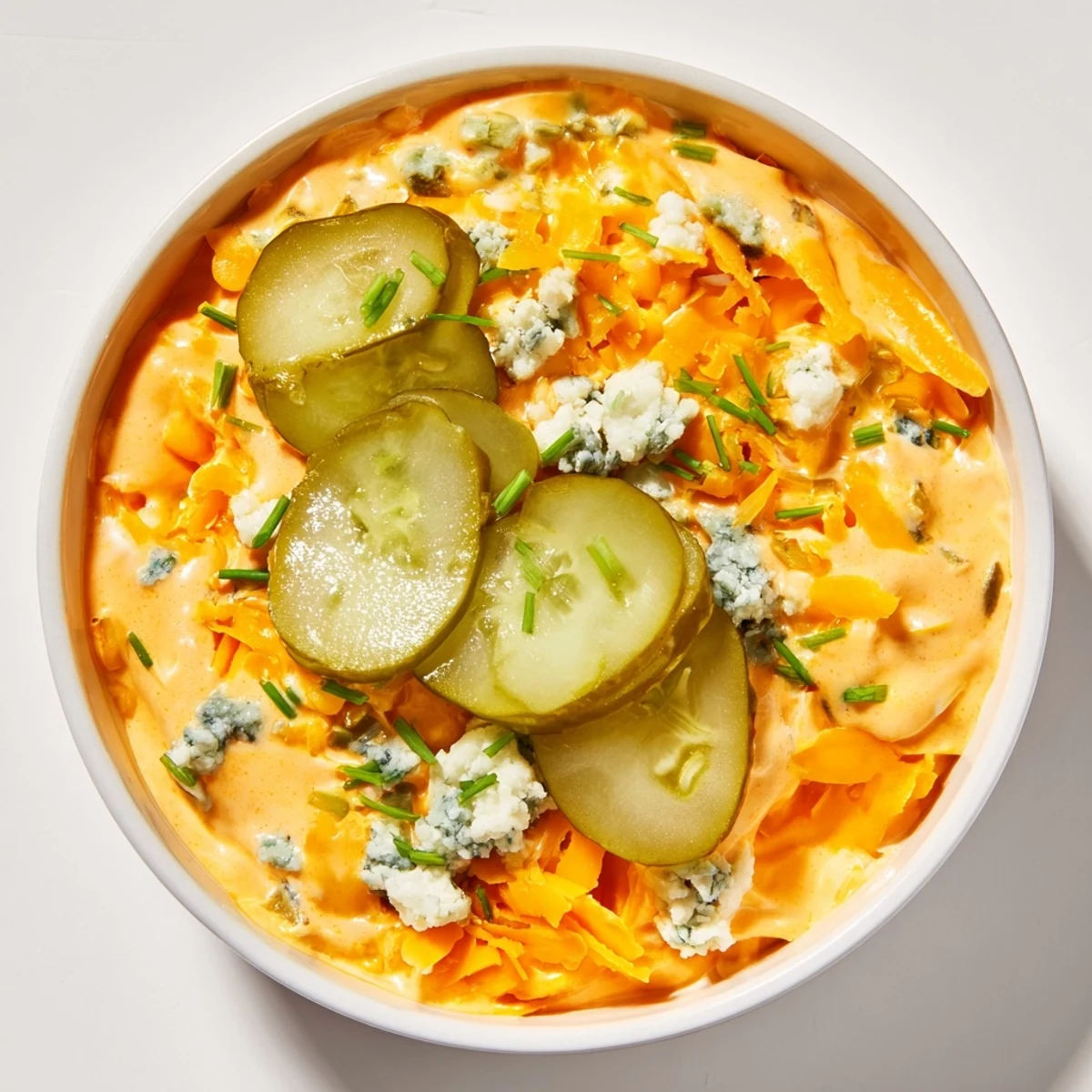 This creamy dip combines the bold heat of buffalo wing sauce with the bright crunch of chopped dill pickles, creating an addictive appetizer that disappears fast at gatherings. The base blends cream cheese, sour cream, and mayonnaise for richness, while shredded cheddar and optional blue cheese add savory depth. Fresh chives and garlic powder round out the flavor profile.