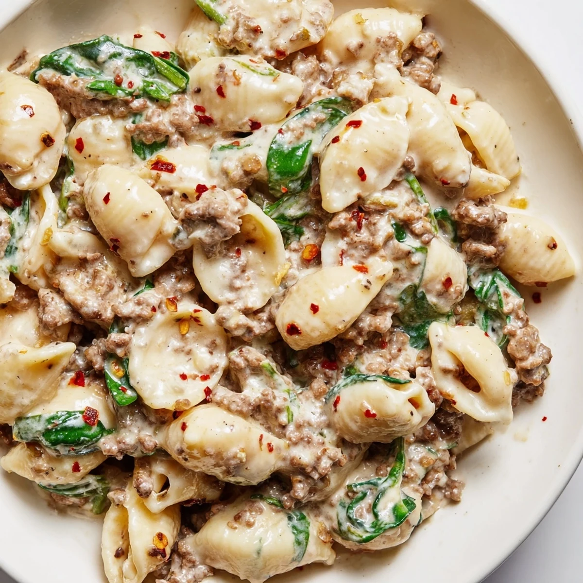 The creamy sauce coats every piece of pasta, and the beef adds savory richness throughout. Adjust the heat with optional red chili flakes for a spicy kick.