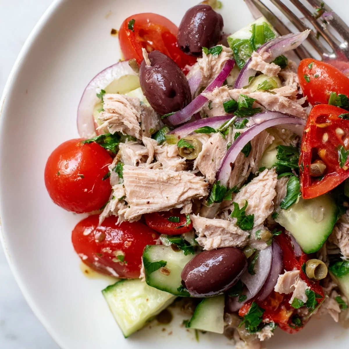 This vibrant Mediterranean-style salad combines protein-rich tuna with crisp cherry tomatoes, diced cucumber, roasted red peppers, and briny Kalamata olives. A simple whisked dressing of extra virgin olive oil, fresh lemon juice, garlic, and oregano ties everything together with bright, zesty flavors that perfectly complement the seafood. Ready in just 15 minutes with no cooking required, this dish makes an ideal light lunch or healthy dinner option during warm weather months.