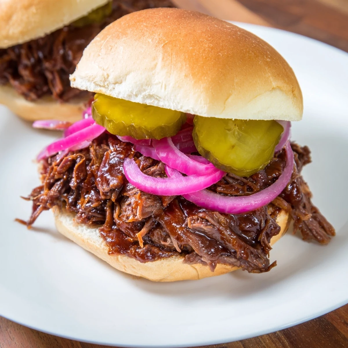 - Pile the saucy pulled beef onto the bottom bun halves, top generously with pickle slices and thin red onion slices, then crown with the buttered tops
