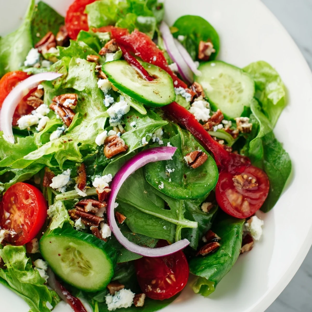 This vibrant spring salad combines tender baby lettuces, arugula, and spinach with crisp cucumber, cherry tomatoes, bell pepper, and red onion. The homemade balsamic vinaigrette with Dijon mustard and honey perfectly complements the fresh vegetables.